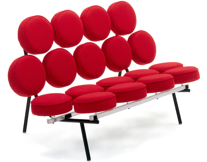 棉花糖沙发,英文名“Marshmallow sofa”,也叫鼓椅、向日葵椅,是设计师George Nelson在1956年设计的,这个设计用18个独立的圆形软垫组成座椅和靠背,“漂浮”在沙发框上。软垫的拆卸十分方便,可轻松完成保洁工作,并可交换各个软垫的位置以保持均匀的使用度,还可选择软垫的颜色,组合出全新的外观,因此很富于游戏感。米勒公司在推出这款产品的时候,说这个沙发是“第一款孕育着全新软椅概念的产品。我们觉得它不仅可以在家里使用,而且可以在与前者环境迥异的公共大厅内使用,它与众不同的外观无疑是公共场合的一道风景线。”软垫的色彩有单一色彩和多种色彩可选,适用范围很广,办公室、大厅、休闲室、客厅或书房等空间都可使用。