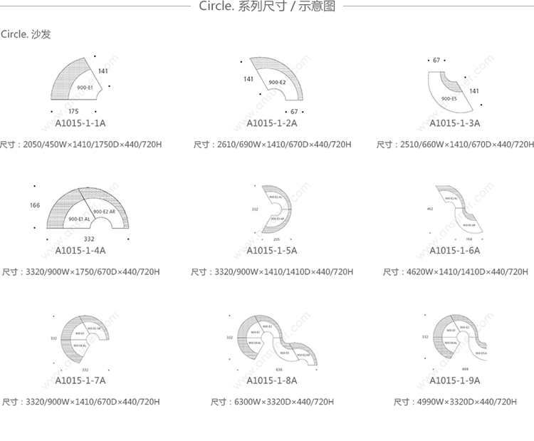 圆椅有四个沙发组成,其中两个沙发可以组成一个半圆,所有沙发都是弧形结构的。背部和休息区的斜率弥补从直立坐着到躺着放松的完整流程。四个沙发其他数据皆有不同只有高度是唯一不变。