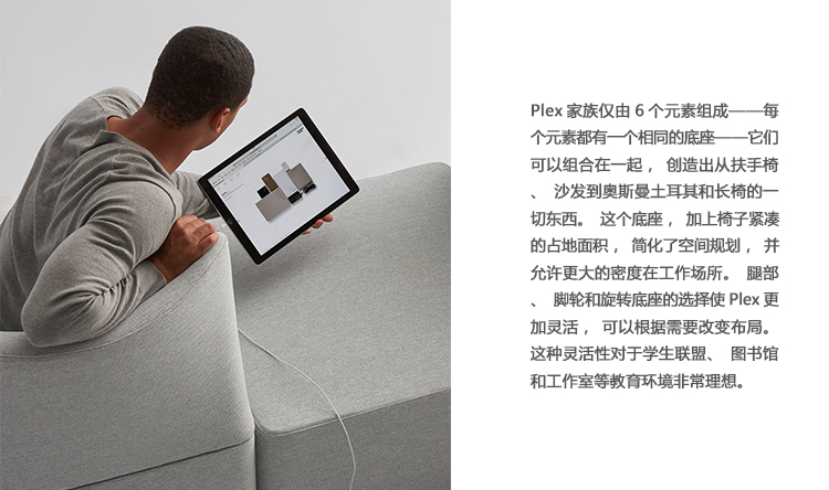 Plex将居住环境的舒适性引入到工作场所。俱乐部的椅子和沙发大小适合各种形状和身材的人。椅子的背部是雕刻的,人们可以根据手头的任务改变自己的姿势,从交谈到处理邮件。