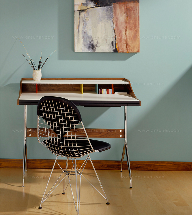 在George Nelson设计出Nelson swag leg系列产品50年后重新推出这款经典产品,主要是因为不管是其外观、尺寸还是功能都非常符合现代顾客的要求。这款办公桌的尺寸非常适合放置笔记本电脑或移动设备底座,并且能有效地利用您家里或办公室的空间。这一系列产品是办公室、会议室和饭厅的理想选择。