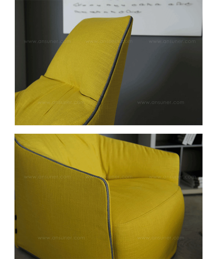 "The Santa Monica Lounge armchair,characterized by a unique design,is a project conceived by the French designer Jean-Marie Massaud,and it is produced by Poliform,a leading company in the made in Italy furniture manufacture.The Santa Monica Lounge armchair on sale in our showroom is matched with the Santa Monica ottoman.Both the items are covered in fabric,yellow colour,with iron coloured stitches."