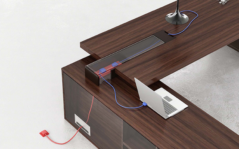 · 会议台通过底座直接连接地插与台面自动线盒,连接方便,使用灵活,桌面自动线盒不使用时可关闭,实现走线隐藏的同时也增加了产品的美观