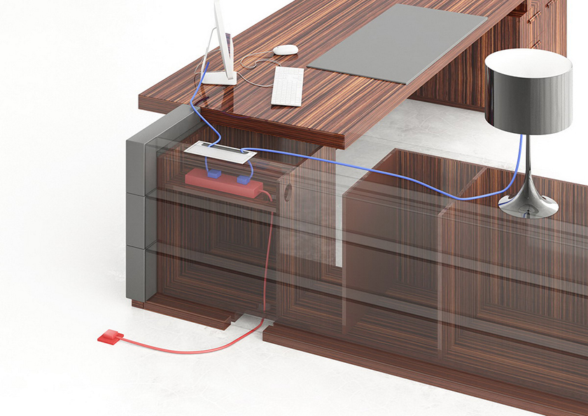 · 班台分内外侧隐蔽式走线通过副台底板和侧板进线口连接地插,实现进线完全隐藏,台面电器可直接打开台面走线盖连接电源,实用方便、灵活,