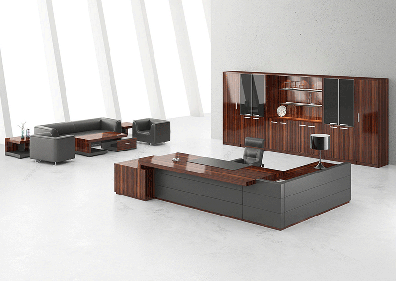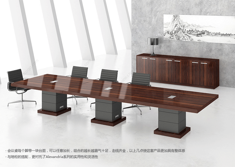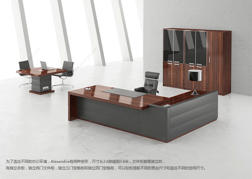 Alexandria是沉稳中带着些威严,四平八稳,有着传统的中国式的美,外形独特,个性张扬。背柜采用特殊的超薄铝合金边框,层板采用背板悬挂方式,射灯及LED灯组又增加了现代气息,威严中透着文雅气质。茶几特点突出,与班台相互协调,沉稳中带着灵性。