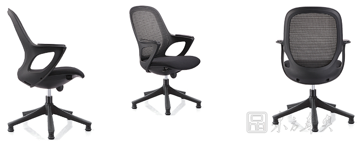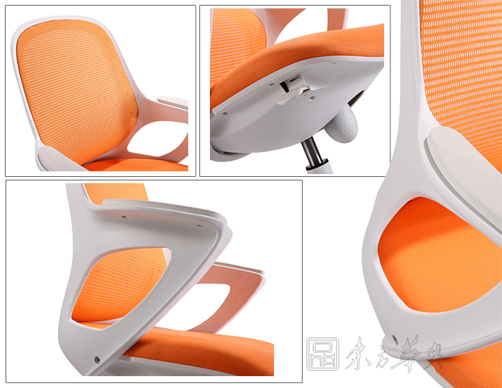 椅背、椅座均为进口网布;黑色塑胶框架、PU扶手垫,塑胶燕尾;进口可回正式气压棒,尼龙椅脚,大直径固定式脚垫。
