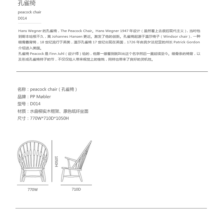 孔雀椅 Peacock 是 Finn Juhl(设计师)给的,他第一眼看到就叫出这个名字然后一直延续至今。 细骨条的椅背,以及形成孔雀样子的节,不仅仅给人带来视觉上的愉悦,同样也带来了良好的灵机性。
