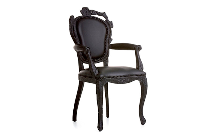 "Pieces of furniture are literally burned,after which they are preserved in a clear epoxy coating.The beauty and character of burned wood is now captured in a long lasting material, creating the strange sensation of sitting on burnt furniture.Maarten Baas is a Dutch designer who graduated from Design Academy Eindhoven in 1996.In 2000 he studied for several months at the Politecnico di Milano. In June 2002 he graduated at the Design Academy a series of burned furniture called "Smoke".Maarten is searching for the boundaries of design,without leaning on the regular"do's and don'ts".The Smoke series includes armchair,dining chair and chandelier. Each item from the Smoke series share the unfamiliar and untamed finish that is categorized by fire.Each piece is unique and may differ due to the process used for production.The smoke chair is upholstered in black leather and has a secret repair kit underneath the seat in case of emergencies."