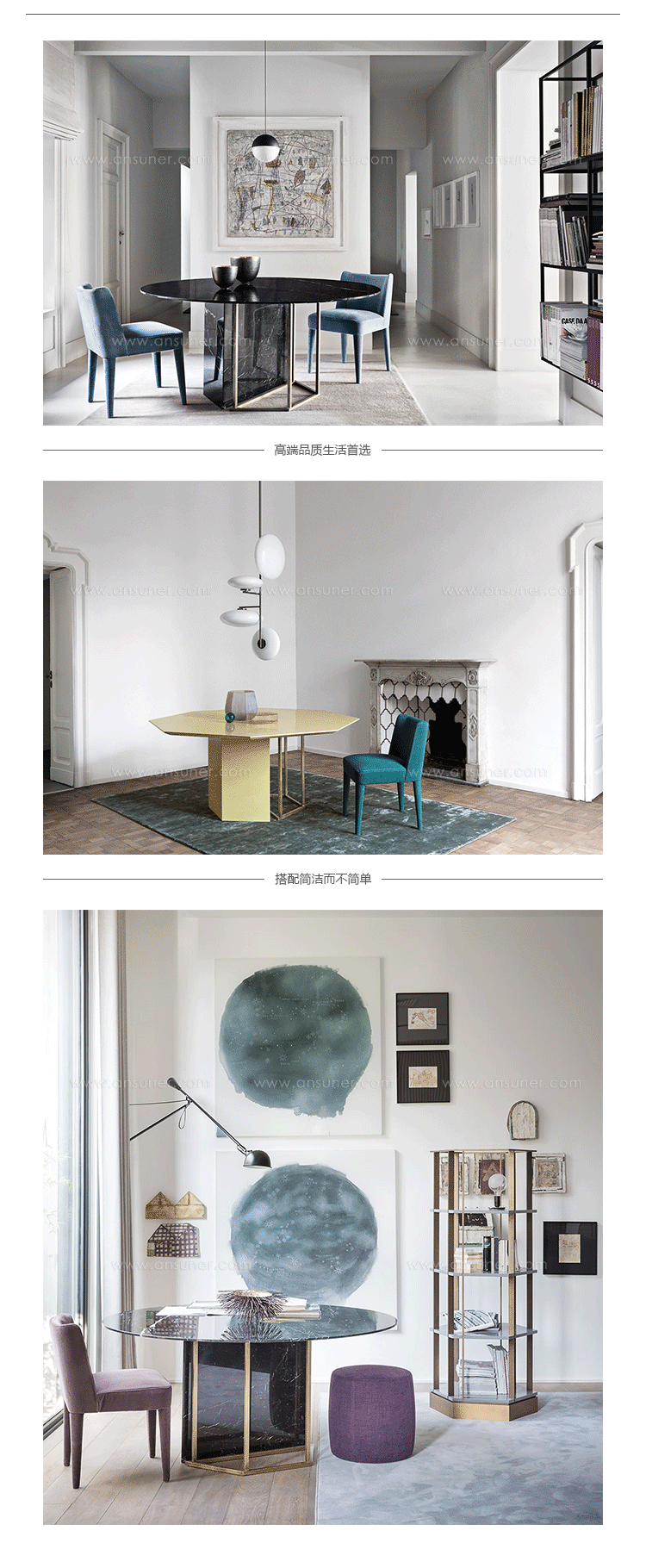 光结构化在黑色金属基地或古铜色的黄铜完成匹配固体体积覆盖着各种大理石、木材或漆完成,自由结合不同形状的顶部给生命一个相互作用的固体和空洞。