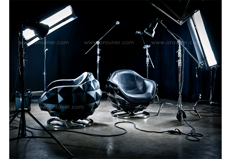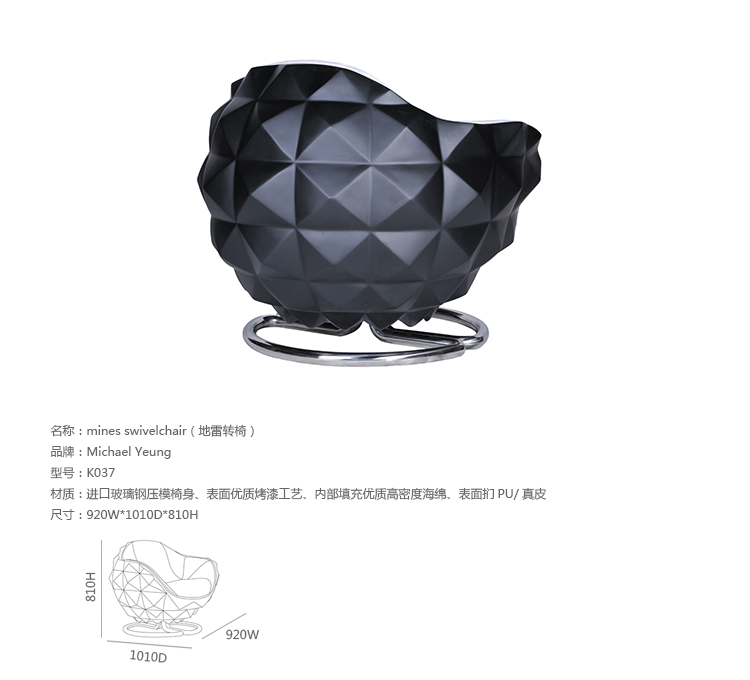 Mines Swivelchair(地雷转椅)是Michael Yeung天马行空的创意作品。地雷转椅灵感来源于深海矿物形态,以此转变成这把舒适的转椅。制作采用进口玻璃钢压模椅身、表面优质烤漆工艺、内部填充优质高密度海绵、表面扪PU/真皮。