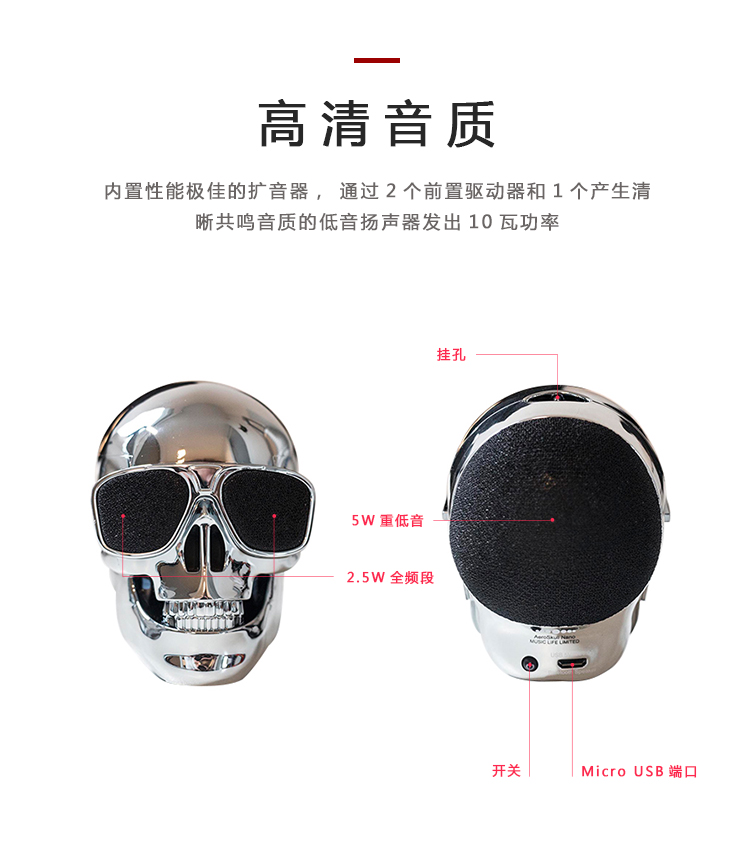 AeroSkull Nano体积小巧,可置于手中(7厘米高),通过蓝牙4.0或3.5毫米Line-in多功能插头可轻松连接到任何智能手机、计算机或CD播放器,是极为便于携带的音箱,外观持久耐用,金属随身夹让爱乐人可以随时与歌同行。