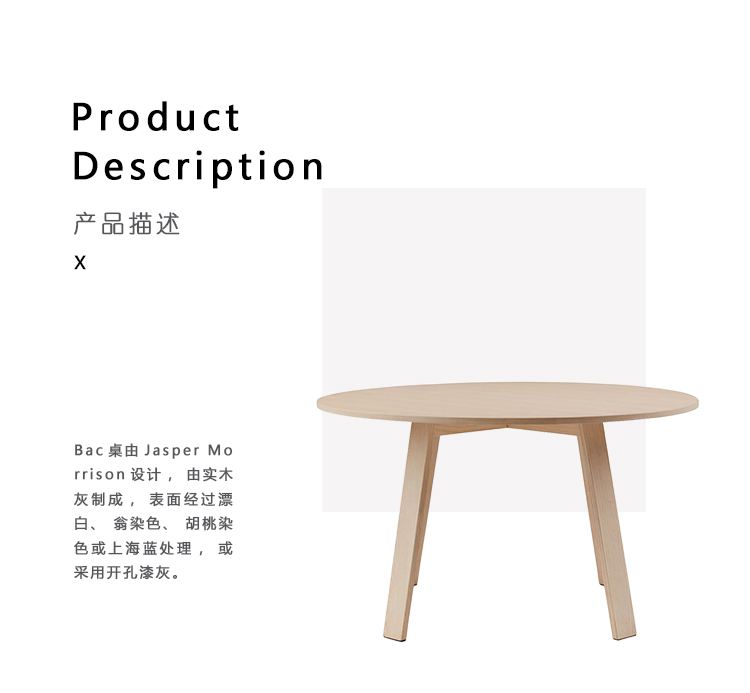 Bac桌由Jasper Morrison设计,由实木灰制成,表面经过漂白、翁染色、胡桃染色或上海蓝处理,或采用开孔漆灰(颜色:云、泥、木兰、橙色、灰绿色或中国蓝)。