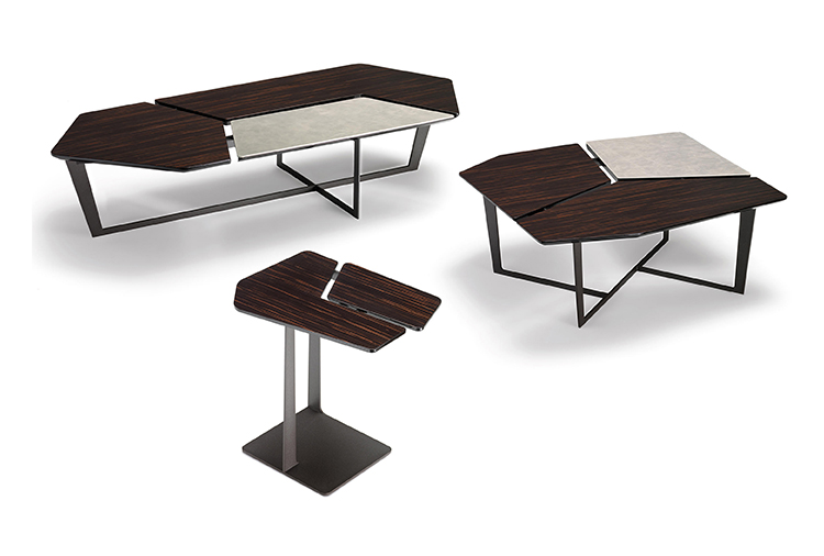 纳尔逊咖啡桌的主要特点是它的桌面。桌面被一个很深的缝隙分开但它们是由结构组成的。将木头和皮革等温暖的材料结合在一起组合成了不规则的几何形状的桌面。托斯卡纳传统的蔬菜鞣革是一种以多种颜色、独特香气和小瑕疵为特点的天然产物。
