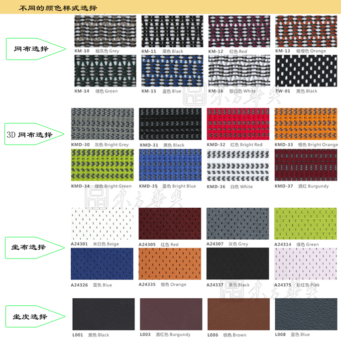 椅背为进口网布加黄牛面皮面料,椅座填充高