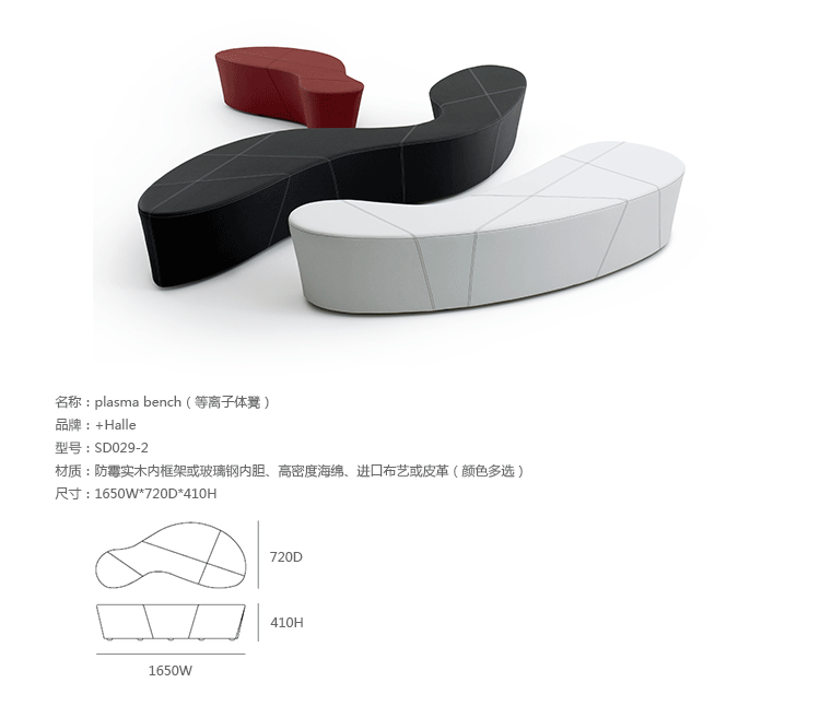 Plasma bench(等离子体凳)是丹麦设计师busk+ hertzog为Halle品牌创作的。Plasma是一个弯曲的概念性的公共座椅。等离子体凳的功能性能非常完美的融入环境,可以单独使用,也可以以不同的组合形式去营造独特、与众不同的空间。4种不同大小尺寸使之很容易表达功能性和各种可能性。最大的等离子体凳超过三个半米长,同时允许多达 10 人的就坐。有机的形状在功能性上表现出强烈的优点,例如大家可以面对面,也可以背对背,可以保持近距离交流,也可以保持一定的私人独立空间。可选的对比拼接提供独特的创造性的组合。Plasma bench(等离子体凳)是IF Design Award和The Good Design Award获奖作品。