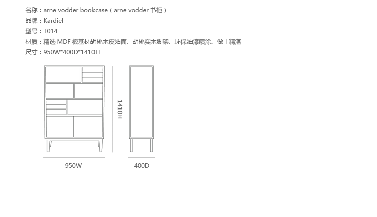 arne vodder bookcase(arne vodder书柜)是Kardiel公司制作的经典实木家具,由丹麦设计师Arne Vodder设计,Arne Vodder是本世纪中期北欧地区斯堪的纳维亚最有影响力的设计师。他设计的作品简单温和并充满人文关怀,而且坚持选用天然材料,时尚的同时保持环保朴素。arne vodder bookcase(arne vodder书柜)有着令人愉快的向日葵花基调,设置多层平滑抽屉,各层抽屉均相互交错,便于存取和摆放。制作采用精选MDF板基材胡桃木皮贴面、胡桃实木脚架、环保油漆喷涂,做工精湛,品质一流。