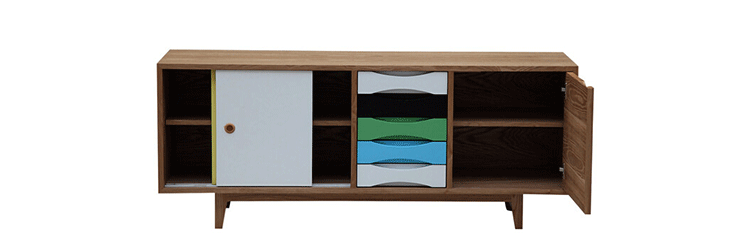 vodder sideboard(vodder餐具柜),Arne Vodder设计的作品,是Kardiel公司制作的经典实木家具,具有世纪中期的现代风格,加了少许复古现代主义色彩于其,微妙的局部拱曲线呈现在右手面对推拉门和5个拉出抽屉。在现代主义的存储家具上,Finn Juhl和Arne Vodder最先尝试胶木和天然木的组合运用。这是大胆的创新,他们结合传统的新鲜的新兴技术与现代主义的概念。制作采用精选MDF板基材胡桃木或水曲柳木皮贴面、胡桃实木或水曲柳实木脚架、环保油漆喷涂、做工精湛,是您理想的选择。