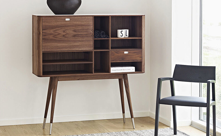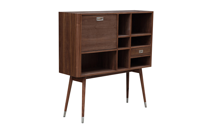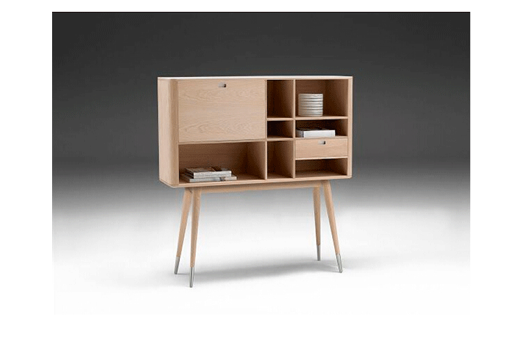 elroy retro upright credenza(埃尔罗伊复古立式书柜)是Kardiel公司制作的经典实木家具,1960年设计,是一件不朽的设。这个当代复古立式书柜有着高高的脚架,多个滑动抽柜和开放式抽屉。它允许“公开展示”和“隐蔽”所有类型的珍惜贵重物品的存储物。不锈钢装饰抽屉拉手和基部的尖尖的脚钉。