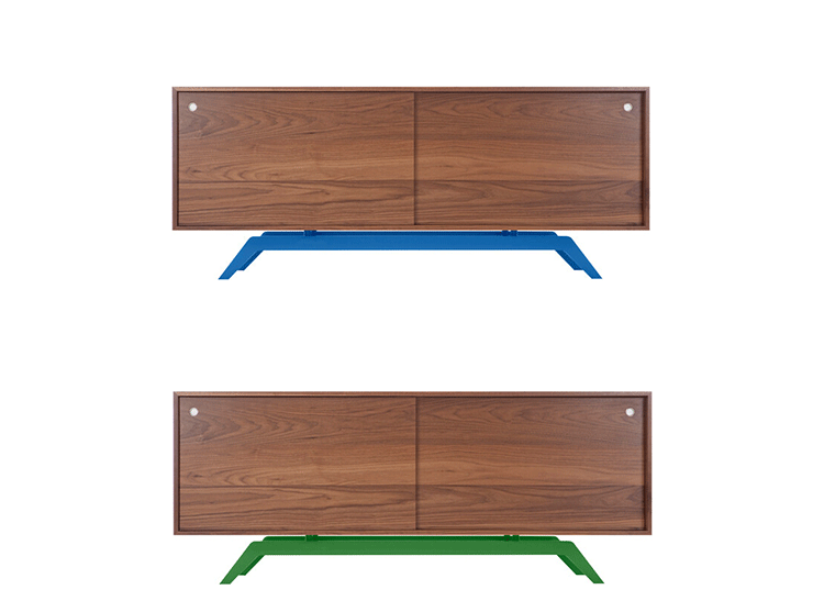 "The sleek base is laser cut and powder coated in one of 6 color options.The box is handcrafted of solid wood with reinforced mitered joints allowing the wood grain to wrap around the entire piece.Behind the smooth sliding doors are adjustable shelves and wire passages that make it a simple and flexible place for all of your media needs,wired and unwired."