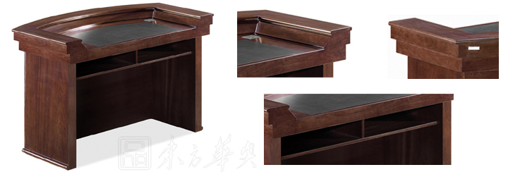 ※    上图为演讲台细节展示图,可选配话筒等配件,优美的弧形主体,木质油漆结构,进口油漆,国内首创内增加纳米银抗菌材料。