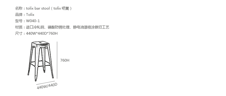 tolix chair(tolix椅)一把有味道、有态度的椅子,据说它最开始被使用在一艘战舰的天气预报房间里,故事的真实性与否不得而知,但是不影响其成为享誉世界的著名设计家具,1934年由Xavier Pauchard设计,早期是作为户外用家具设计,力图展现法式慵懒而闲适的气质,经年而来被全世界时尚设计师所宠爱,从室外扩展到家居、商业、展示等多个用途,而此椅也不负众望在各类空间中均有上佳表现,特别是近年来与混搭、乡村、美式、怀旧、北欧简约、中式等主要装修风格搭配,都呈现出独特的韵味,也被时尚界赞为“百搭第一”椅,可以用在酒吧,餐馆,咖啡馆等等地方,之后通过改进,设计出有扶手版本的tolix armchair(tolix扶手椅),高背版本的tolix high back bar stool(tolix高背吧凳),宽背版本的tolix wide back bar stool(tolix宽背吧凳),及tolix bar stool(tolix吧凳)和tolix mini stool(tolix迷你凳)。制作采用进口冷轧钢、磷酸防锈处理、静电油漆喷涂工艺、坐面为木板或PU海绵坐垫,颜色可选。