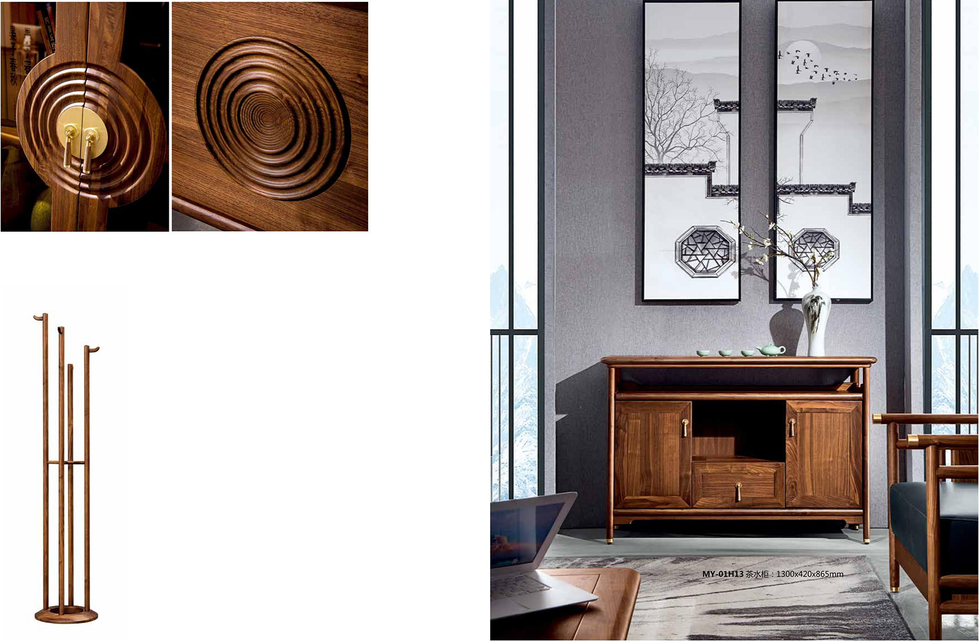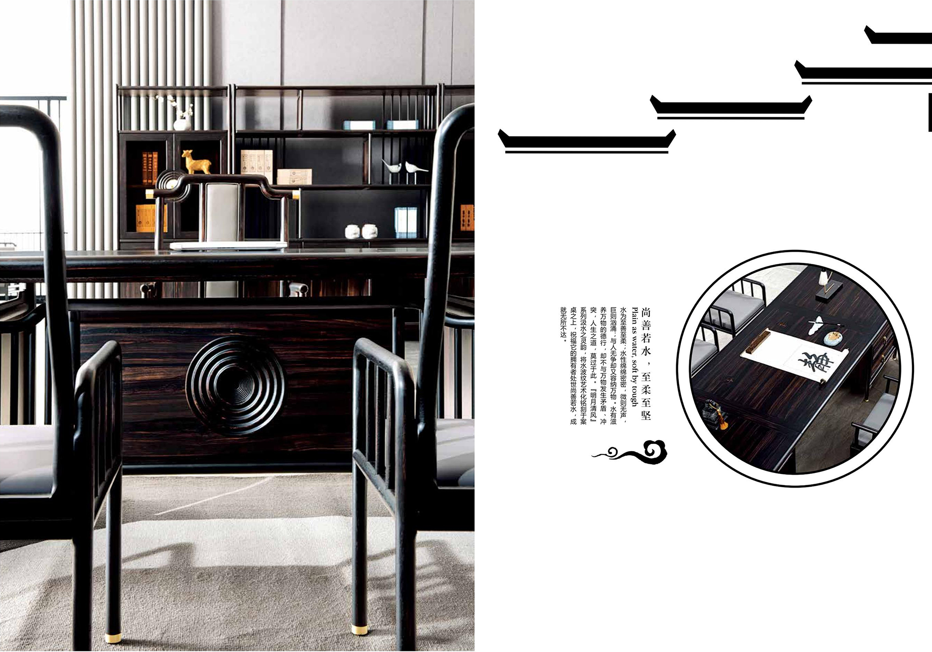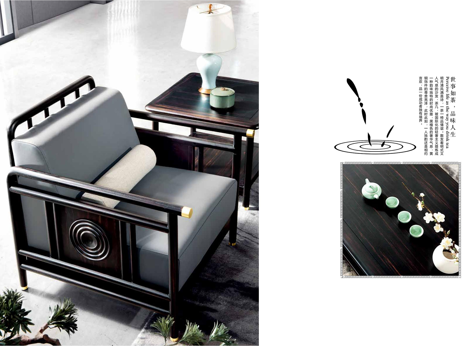【尚善若水,至柔至坚】 水为至善至柔“水性绵绵密密“微则无声,巨则汹涌·与人无争却又容纳万物“水有滋养万物的德行“却不与万物发生矛盾“冲突“人生之道“莫过于此,【明月清风】系列汲水之灵韵“将水波纹艺术化铭刻于案桌之上“祝福它的拥有者处世尚善若水“成就无所不达。 【世事如茶“品味人生】 明月清风满是诗·一茶一椅品情谊“散发着明式文人气息的沙发“茶几 被国际化的轻奢主义提炼成一种韵味独特的时尚优雅 黑檀色的奢华气息 黄铜饰件的尊贵亮泽 此时此刻“一人独酌还是相约言欢 品一份成功者独有境界。