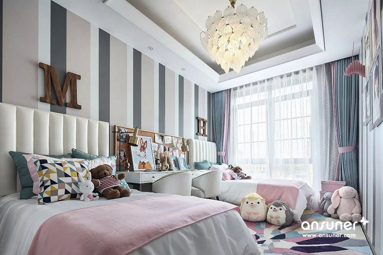 在女儿房设计中,经由马卡龙色调的清甜组合,一个甜美温馨的童话乐园于此诞生,柔软温暖的的拼布地毯上,安放着粉白相间的小床,可爱的动物们相伴左右,一切的一切,仿佛都在共同制造着童年轻快的幻梦。一个浪漫的水晶饰品吊灯,散发出纯净通透的光,让甜蜜浪漫在空间萦绕着。