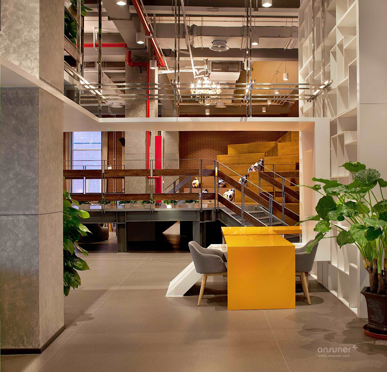 入口处醒目的大红色门厅,墙壁饰面采用集装箱纹理,与接待台后的木色饰面即形成了鲜明对比,同时又烘托出了温暖、开放的环境氛围,独特的工业风格特色让人第一眼就留下深刻印象。铁制的接待台经过特殊锈化处理,展现出了斑驳仿旧的视觉效果。